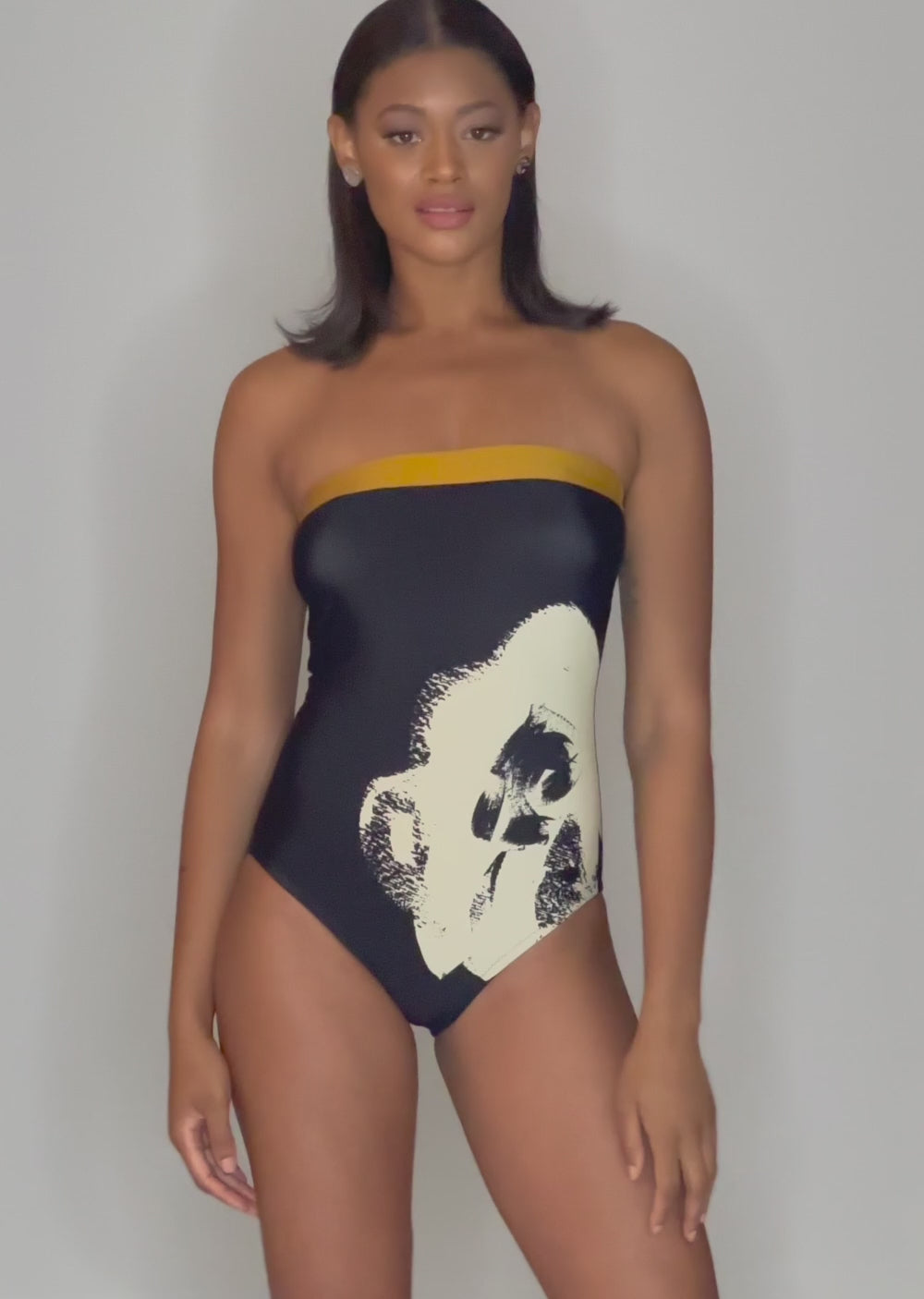 Bandeau one piece with soft molded cups, moderate leg height and full back coverage. Our exclusively designed soft cup bra liner construction enables the top to fit a range of cup sizes from A-DD. Detachable neck straps tie at neck with Tara Grinna charms that dangle from the ends.