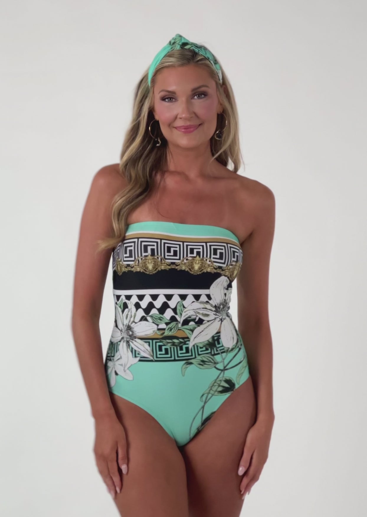 Bandeau one piece with soft molded cups, moderate leg height and full back coverage. Our exclusively designed soft cup bra liner construction enables the top to fit a range of cup sizes from A-DD. Detachable neck straps tie at neck with Tara Grinna charms that dangle from the ends.