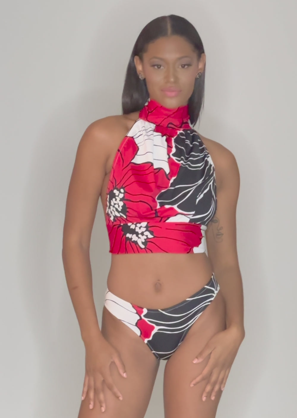 Our Spring & Summer 2023 Swim and Resort Wear Collection presents a bold and vibrant black, white, and red floral print, inspired by the picturesque blooms of La Spezia, Italy.
